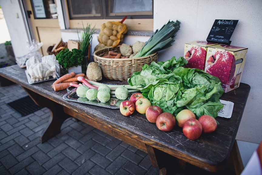 Im Hofladen bekommen Sie Rindfleisch, Eier, Brot, Obst und weitere Erzeugnisse aus eigener Landwirtschaft.